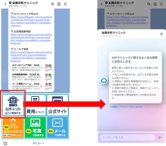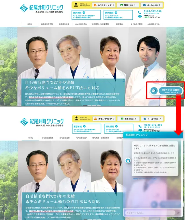 これにより、診療時間やアクセスなどの基本情報はもちろん、「自毛植毛」や「AGA(男性型脱毛症)」といった薄毛に関する一般的なご質問にも、AIが24時間自動でお答えできるようになりました。
